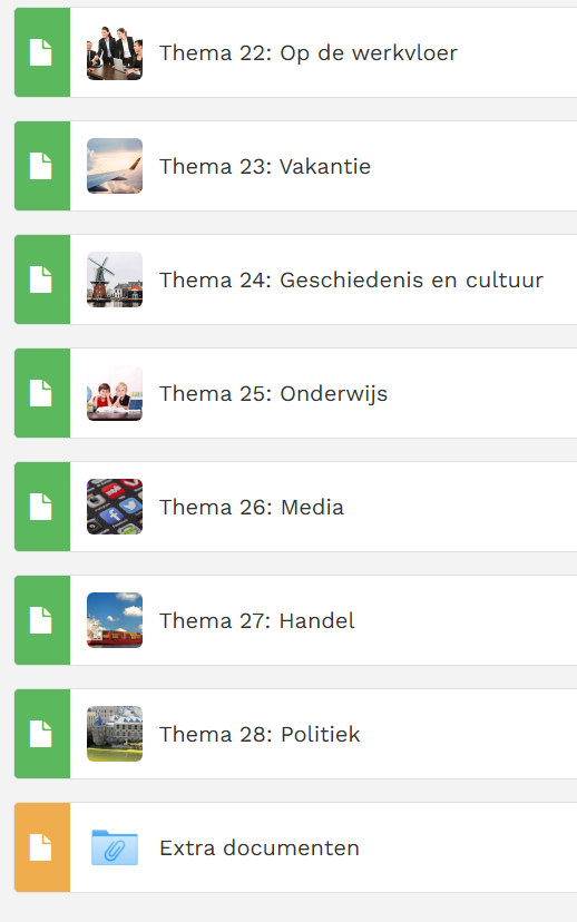Met de e-learning van Nieuwe Start! Nederlands A2-B1 kunt u op de computer de leerstof oefenen. De e-learning bestaat uit thema's. Deze thema's zijn gelijk aan de thema's die in de 2 boeken worden behandeld: Dagbesteding, De woning, Relaties, Gezond leven, Eten en drinken, Instanties, Vervoer, Op de werkvloer, Vakantie vieren, Geschiedenis en cultuur, Onderwijs, Media, Handel en Politiek.
